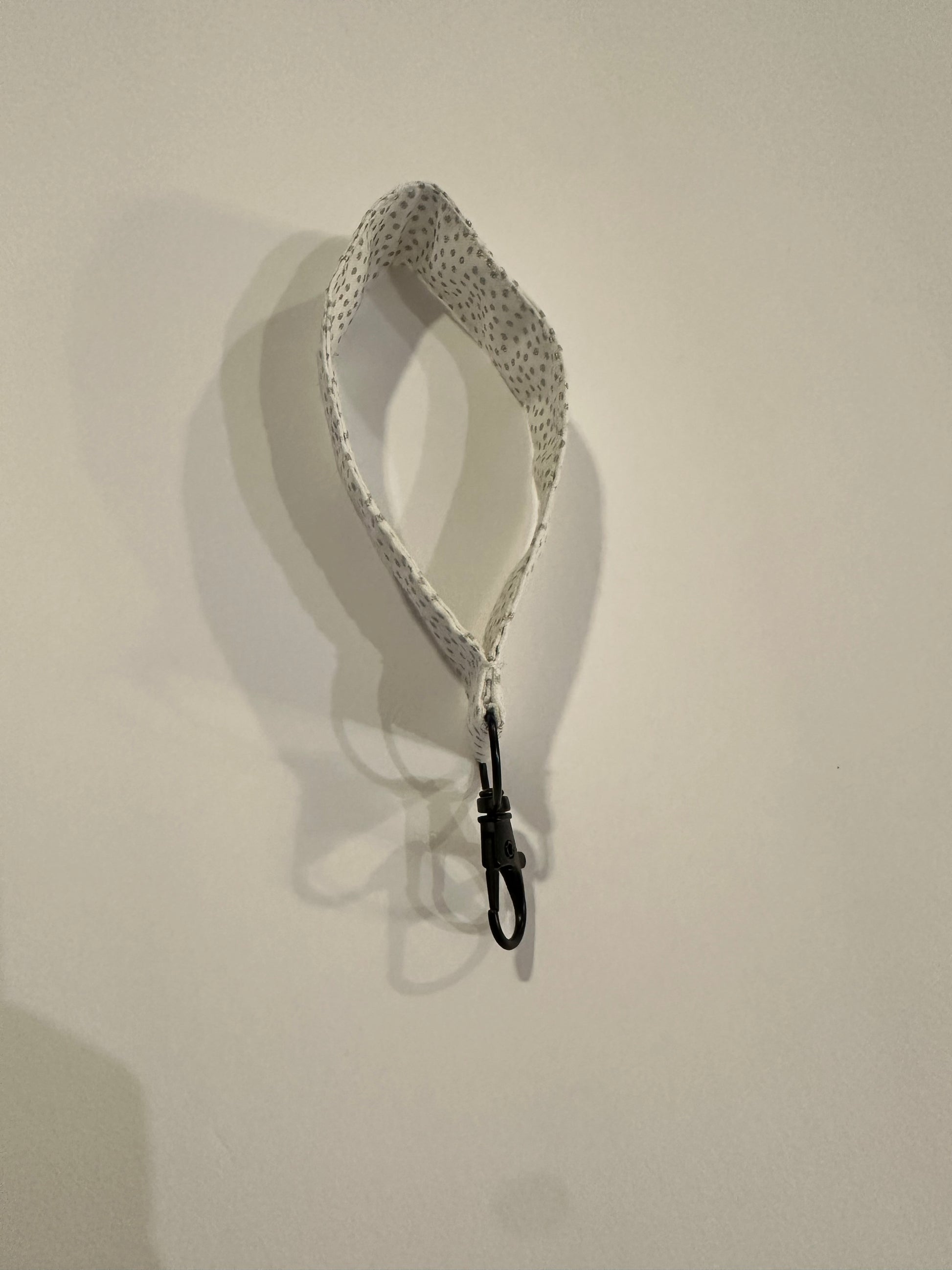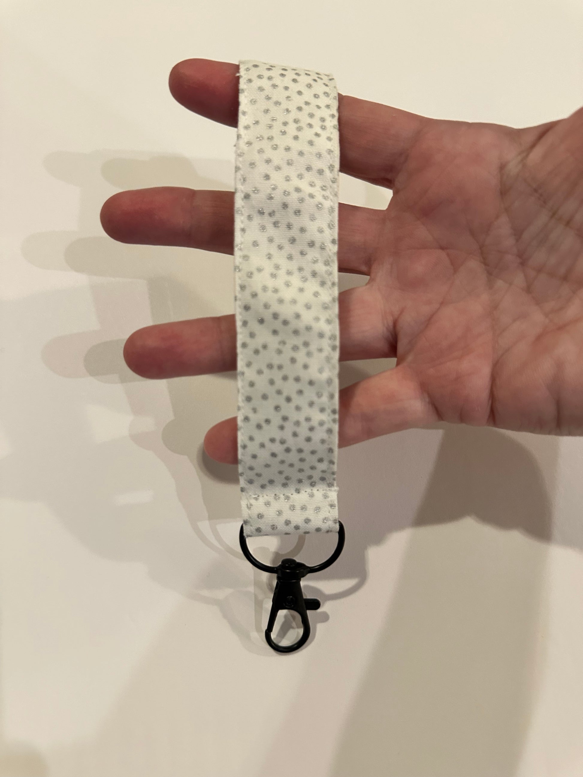 This is a hand made wristlet with a swivel keychain at the bottom. It is great to hold key fobs, charms and even better for your dogs poop bag dispensers.